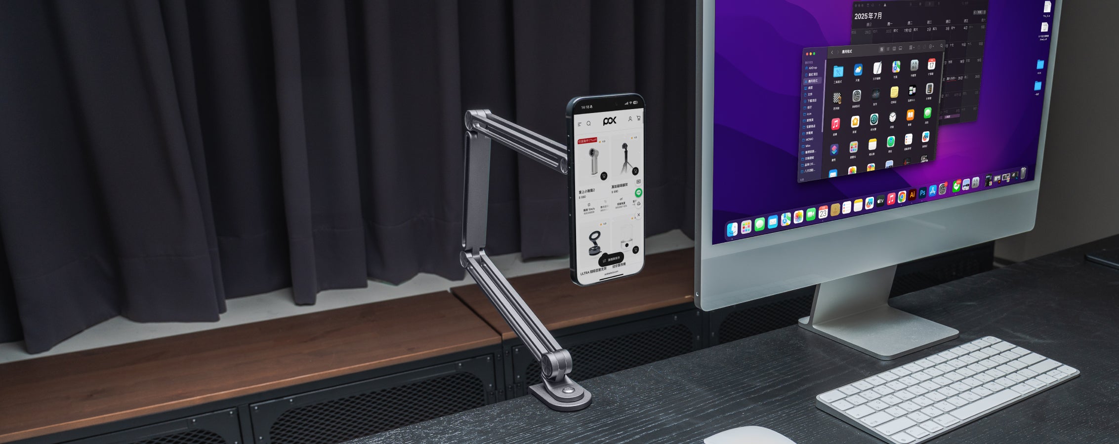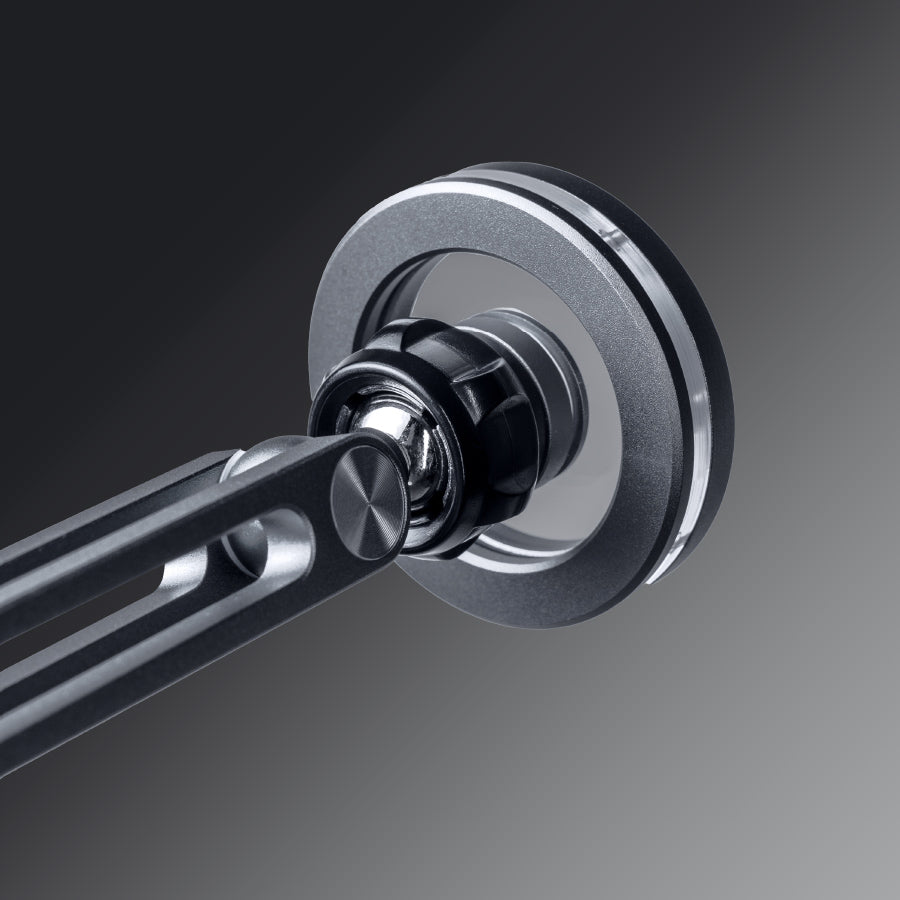 - 請將底座旋鈕固定於桌面邊緣,調整所需夾距後鎖緊。將手機貼附於磁吸盤上,即可穩固懸掛。