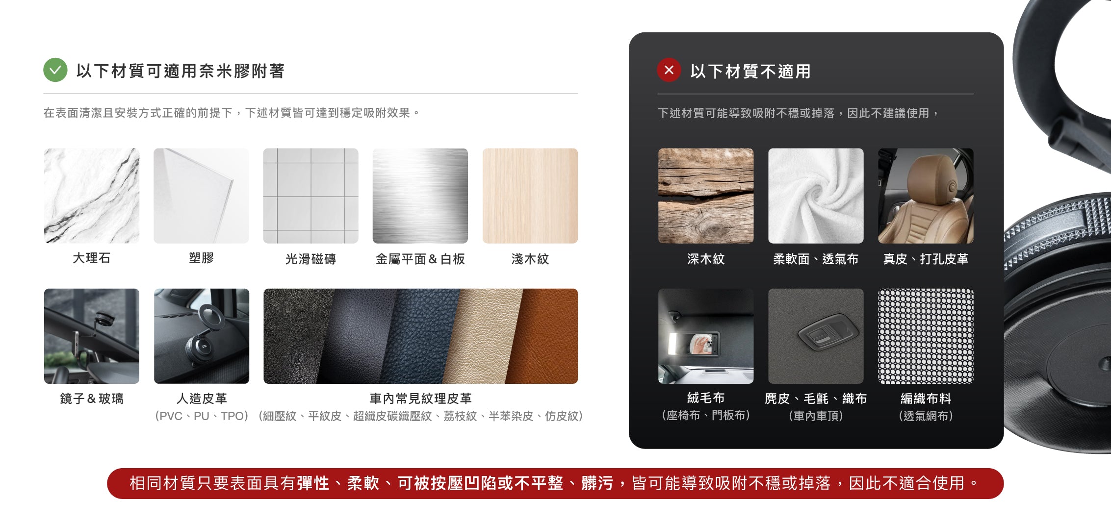 即使為相同材質,只要表面具有彈性、柔軟、可被按壓凹陷或不平整,皆不適合使用,可能導致吸附不穩或掉落。