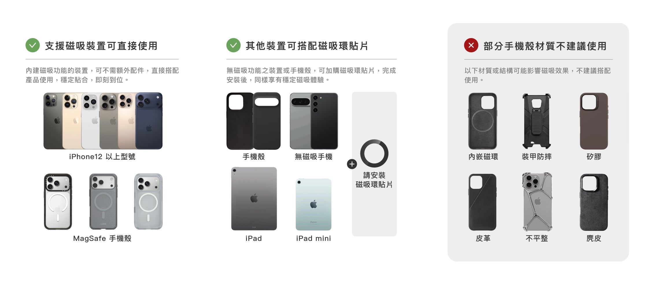 實際使用前,請務必確認安裝表面為硬質平面,以確保吸附穩定性並降低使用風險。